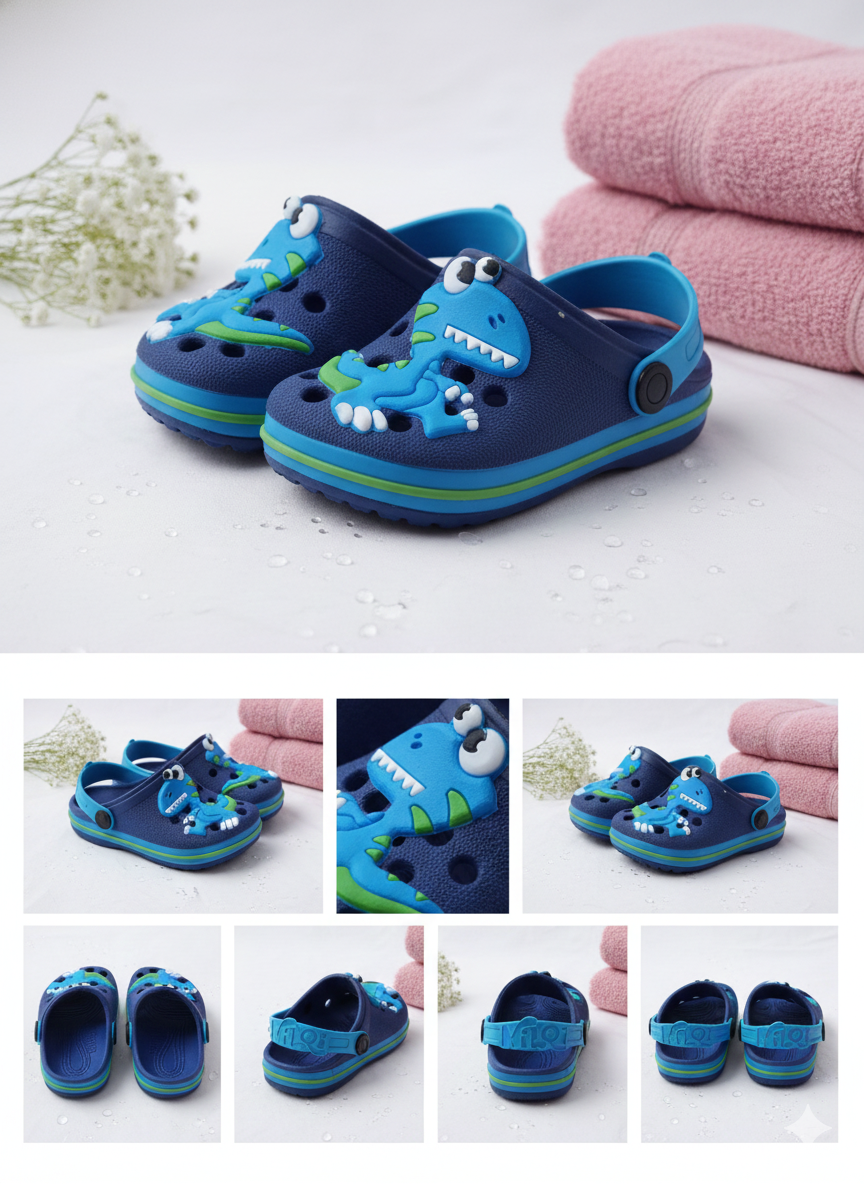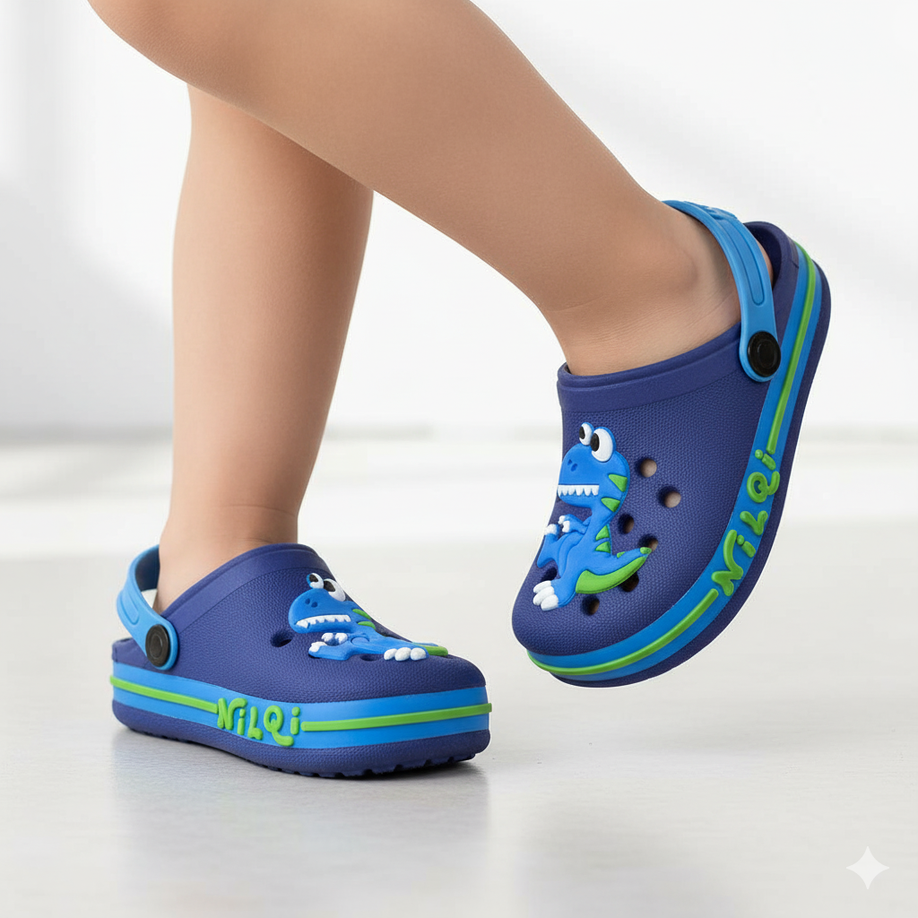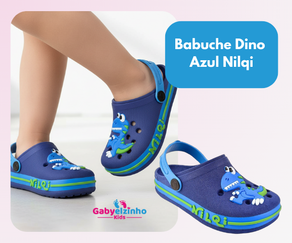O babuche infantil masculino Nilqi azul com dinossauro foi feito para crianças que vivem em movimento.